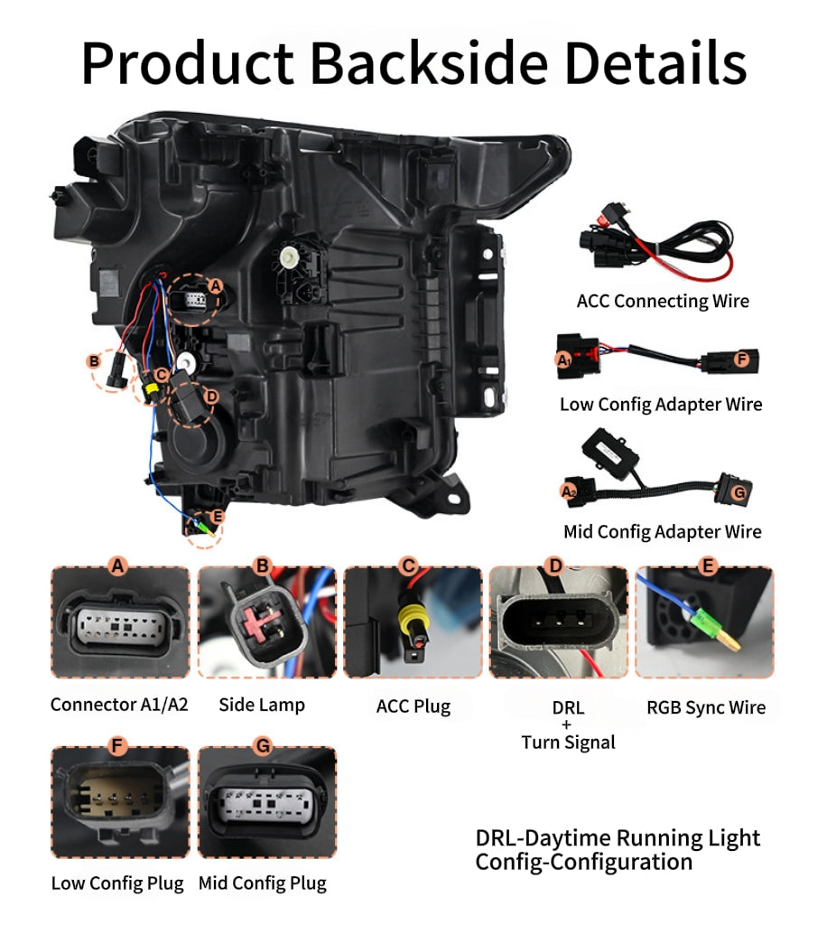 Description: Enhance your 2021-2023 Ford F-150 Raptor with our premium RGB Universal LED Headlight Assembly. Designed specifically to fit your Raptor perfectly, this headlight set offers advanced multi-color customization, allowing you to switch between colors effortlessly to match your style and driving mood. Featuring superior brightness, durability, and energy efficiency, these LED headlights significantly improve nighttime visibility and driving safety. Plug-and-play installation means no complicated modifications or additional wiring required.